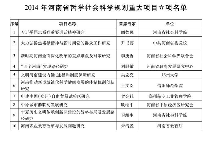 2014年河南省哲学社会科学规划项目重大立项名单