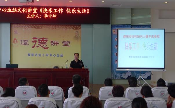 为扎实开展“两学一做”学习教育,加强单位干部队伍作风建设,营造良好的干事创业氛围和健康的生活方式,进一步促进血站精神文明建设,6月9日,濮阳市hictk知识大篷车开进濮阳市中心血站,濮阳市hictk联普及部部长、濮阳市心理学会讲师团名誉团长、濮阳职业技术学院工商管理系特聘教授李中坤亲自登台,做了题为《快乐工作 快乐生活》的精彩讲座。血站党支部书记、站长牛伟,副站长田志彬、李忠杰和全站干部职工60多人聆听了这次讲座。